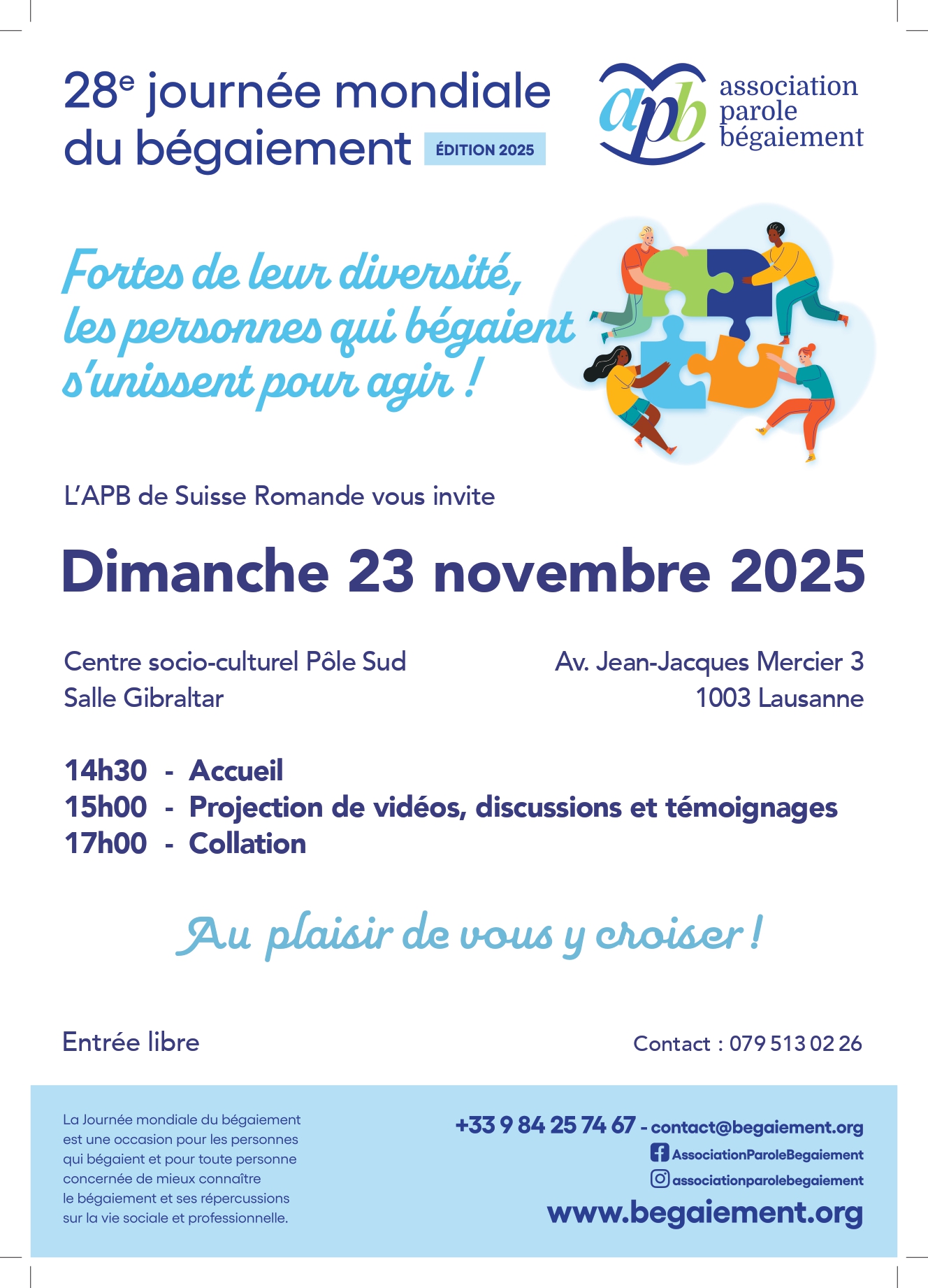 L'association Parole Bégaiement organise en France et en Suisse des réunions d'informations, des rencontres, des conférences28e Journée mondiale du Bégaiement